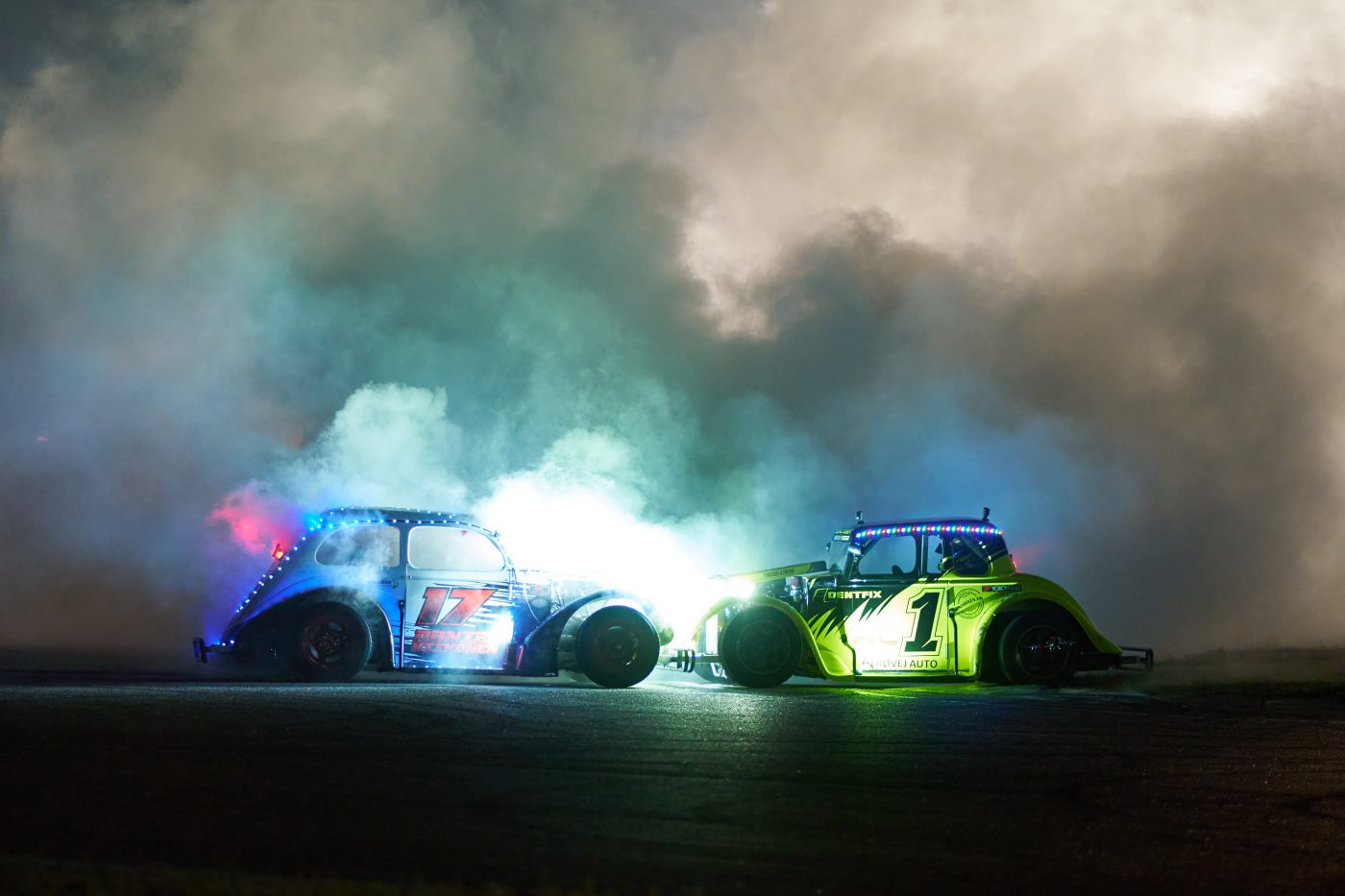 Kørerne i Daarbak redoffice Legend Car Cup har for længst været i gang med at gøre klar til denne festaften i mørket. De to første af klassens i alt tre løb finder sted i fuldt dagslys, men når det tredje løb køres – finalen – sker det lørdag 20.45. Efter mørkets frembrud. Deltagerne har ikke bare monteret ekstra belysning for deres egen skyld. De har også forsynet deres diminutive racerbiler med individuelle, farverige lyseffekter, der får smilet frem hos publikum, og helt sikkert giver inspiration til en tilskuer eller to, når denne om nogle måneder skal forberede juleudsmykningen hjemme på villavejen…
